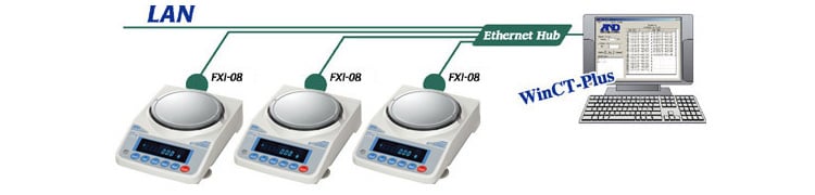 通過使用以太網(wǎng)接口(FXi-08,另售),可以與局域網(wǎng)上的計(jì)算機(jī)進(jìn)行雙向通信,并且可以將來自多臺(tái)天平的數(shù)據(jù)導(dǎo)入一臺(tái)計(jì)算機(jī)。